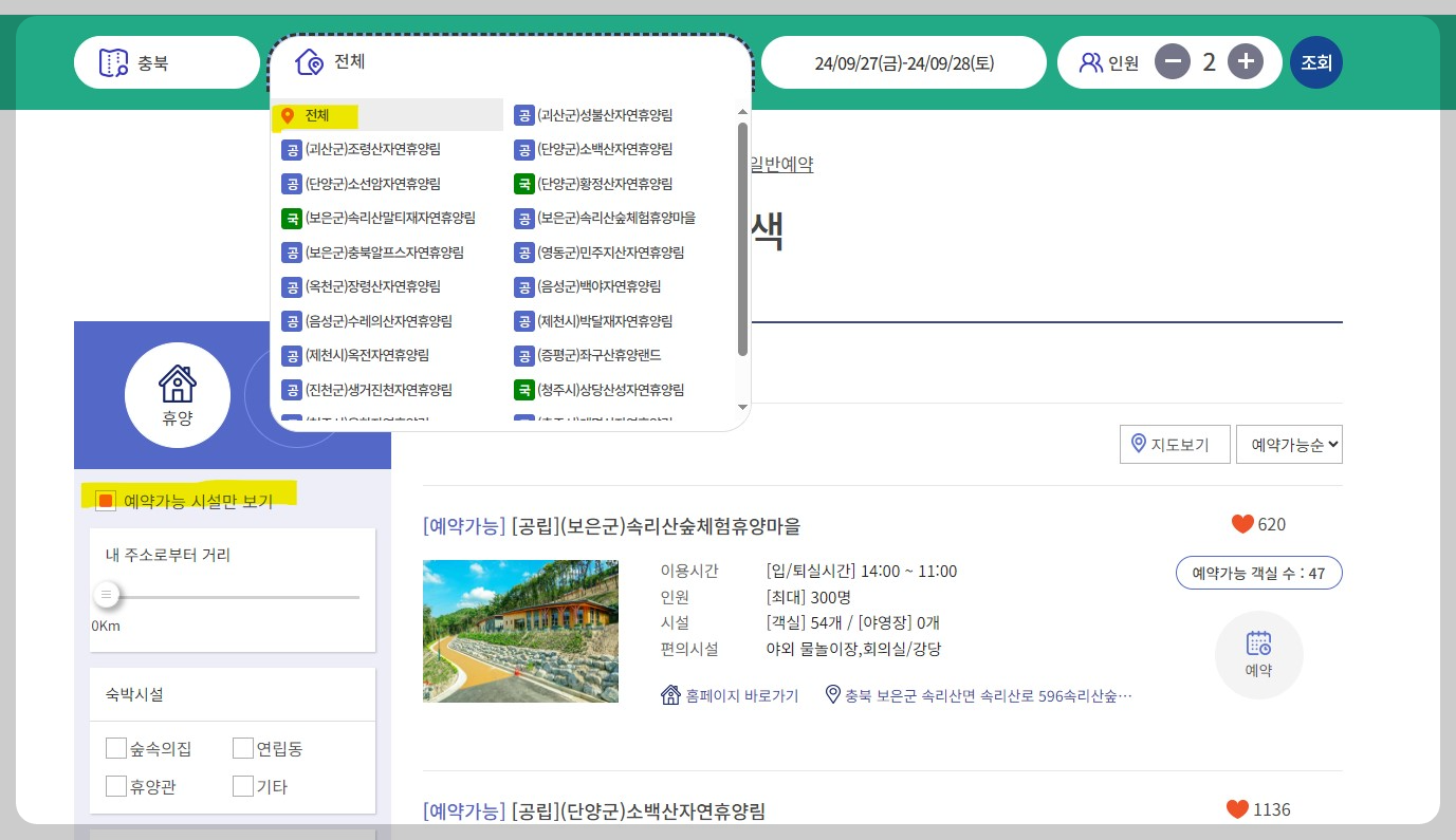 예를 들어, 위와 같이 '지역-충북'과 날짜, 인원 수를 선택 후 휴양림 목록을 일일이 찾으실 필요 없이 '전체'를 선택합니다. 그리고 왼쪽 중앙쯤에 있는 '예약가능 시설만 보기'를 선택하시면 희망 날짜 및 지역에서 예약 가능한 휴양림 목록을 보여줍니다. 처음 휴양림 예약을 이용하시는 분들께 유용할 것 같습니다.
