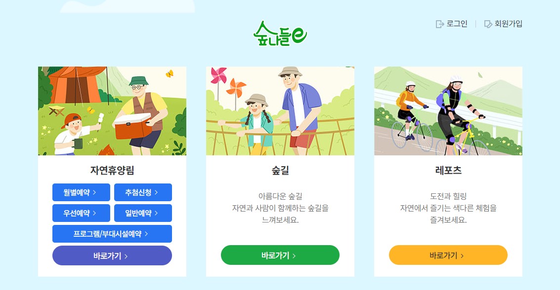 국립자연휴양림 예약은 산림청에서 운영하는 공식 사이트인 <숲나들e>를 통해 예약하실 수 있습니다. <숲나들e>는 전국의 자연휴양림 정보를 제공하며, 실시간 예약이 가능한 시스템입니다.
