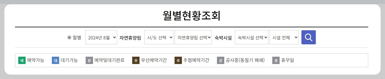 월별 예약현황을 통해 예약 가능한 휴양림 및 잔여객실을 확인하실 수 있습니다. 방문을 원하는 '시/도'를 선택하면 해당 지역의 자연휴양림이 목록에 뜹니다. 수도권에서 멀어질수록 잔여객실이 많은 편이며, 국립자연휴양림은 비교적 저렴하기 때문에 국립자연휴양림 예약이 훨씬 치열합니다.
