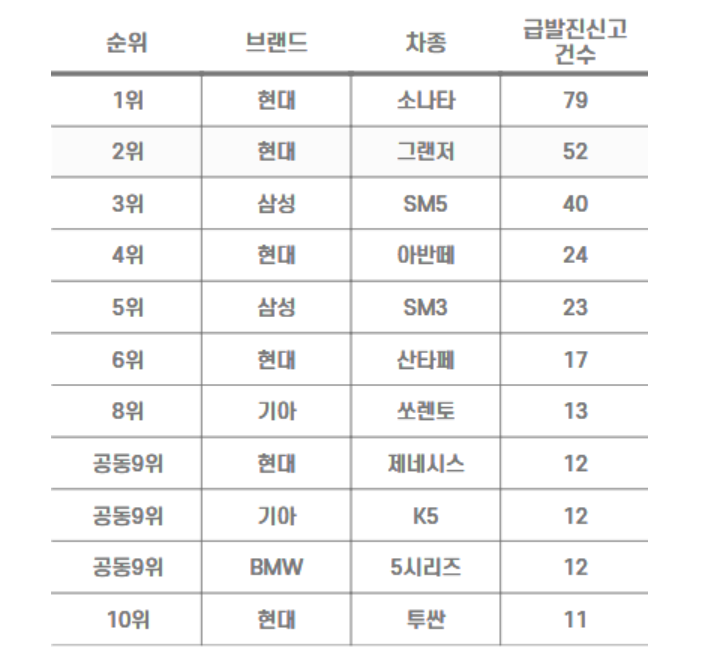 급발진 신고 건수와 순위가 높다고 위험한 차량은 아닙니다. 차종의 판매 대수가 많을수록 신고 건수가 많은 것을 확인할 수 있습니다. 무슨 차를 타든지 위험 상황에 대비하여 대처방법을 기억하고 있는 것이 중요하겠습니다.