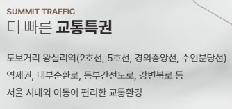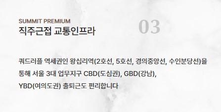 ✅ 또한 차로 10분이면 내부순환로를 탈 수 있으며, 왕십리역은 2028년 GTX-C 노선, 2026년 동북선 개통도 예정에 있는 만큼 동서울 교통의 중심으로 올라서고 있습니다.