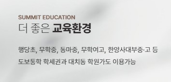 ✅ 라체르보 푸르지오 써밋의 교육환경도 아주 좋습니다. 단지 입주민은 단지 바로 앞에 있는 행당초등학교로 배정을 받으며, 무학고·무학여고·무학중이 도보권으로 단지 바로 옆 아주 가까이에 위치합니다.