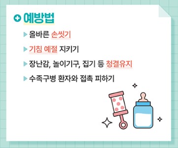 - 공공장소 피하기: 수족구병 유행 시기에는 사람이 많이 모이는 곳을 피하고 특히 어린아이들이 자주 가는 놀이방이나 키즈카페, 유치원에서 위생 관리에 신경 써야 합니다.