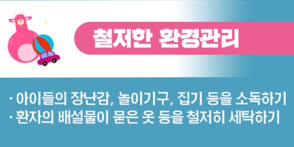 수족구는 주로 감염된 환자의 분비물(침, 콧물, 물집의 액체 등)과 접촉할 때 전염됩니다. 또한 공공장소에서의 비말 감염도 가능하며, 오염된 물건을 만진 후 입에 손을 대면 쉽게 감염될 수 있습니다. 따라서 수족구 환자가 발생한 가정에서는 아래의 소독 방법까지 익혀 두시는 것이 좋습니다.