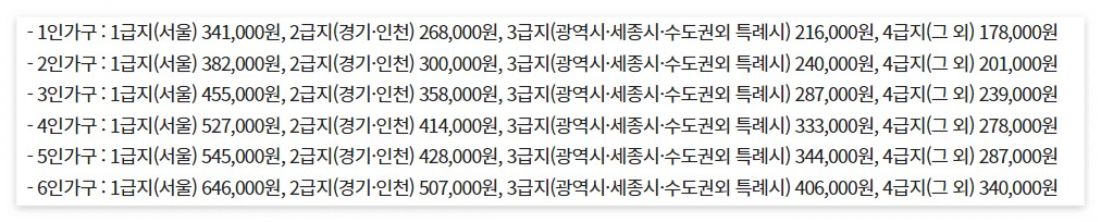 4인 가구 기준으로 서울은 455,000원, 경기도는 358,000원이 상한선입니다. 실제 임차료는 임대차 계약서의 보증금과 월차임을 합하여 산청 하며, 보증금은 연 4%를 적용하여 월차임으로 환산합니다.